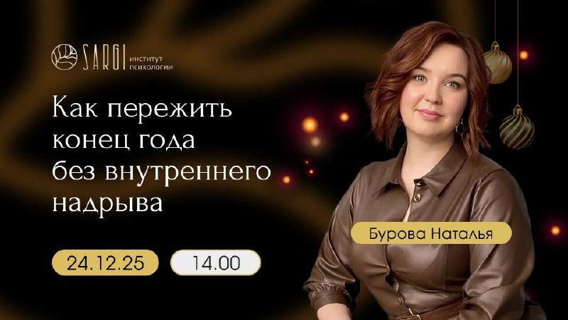 ? Разберем уже сейчас на эфире с Натальей Буровой На встрече мы с вами: 📌 Исследуем корни новогодней тревоги: страх оценки (своей и чужой), ощущение упущенного времени и давление «обнулиться» с 1 января 📌 Обсудим эффект толпы и коллективное давление: как массовое предновогоднее безумие, «все должны быть счастливы», гонка за идеальным праздником и культ продуктивности делают конец года особенно болезненным 📌 Получим алгоритм экологичного завершения года — как прожить праздники без токсичных обещаний себе и гонки за «новой версией себя» В результате встречи: ✔️ вы осознаете причины своей тревоги, ✔️ перестанете требовать от себя невозможного ✔️ научитесь проживать переход в новый год с принятием и заботой о себе 🔗 ЭФИР ЗДЕСЬ 🔗 ЭФИР ЗДЕСЬ 🔗 ЭФИР ЗДЕСЬ