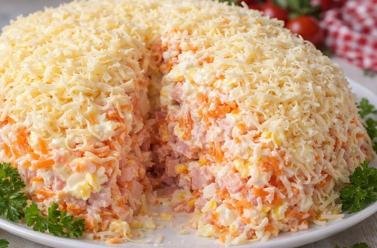 «А что это за салат? Дай рецепт!» Он нежный, сочный, сытный и очень эффектно смотрится на столе. Подходит и для Нового года, и для дня рождения, и просто для семейного ужина. По желанию: немного чеснока или зелени для аромата. Салат можно выкладывать слоями или просто аккуратно перемешать — вкус от этого не страдает. Слои (по желанию): Дайте салату настояться в холодильнике хотя бы 1–2 часа — он станет ещё вкуснее. Каждый раз он «улетает» первым — проверено не одним праздником. Если вы ищете беспроигрышный салат, который понравится и семье, и гостям — обязательно попробуйте этот рецепт.