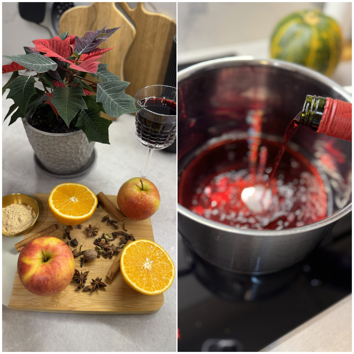 Зимой особенно ценны замедление, восстановление и часто домашнее уединение. Хочется больше уюта, маленьких радостей, аромата и тепла от свечей и вкусной еды. И возникает вопрос, как мягко согреться зимним вечером — предлагаем приготовить насыщенный и сбалансированный по вкусу глинтвейн. В такое время года особенно актуально пряное "горячее вино" с древнеримскими корнями и зимними рождественскими традициями. Пусть погода и переменчива, мы дождались снежных вечеров и взяли красное сухое вино. Довели его почти до безалкогольного состояния — лёгкое нагревание испарило большую часть спирта, оставив лишь глубокий вкус. И важно не доводить до кипения, только на медленном огне готовим, это супер важный момент. Не оставляем без присмотра, хотя оторваться и так сложно — аромат нарезанных долек апельсина, яблока, целой корицы, гвоздики и бадьяна — создаёт мгновенное ощущение праздника. Уже сразу в процессе приготовления обволакивает это радостное чувство. И, конечно, мы не мы, если не найдём пол
