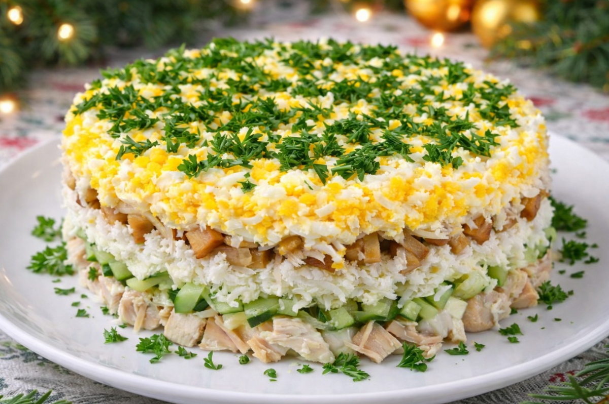 Есть блюда, которые выглядят очень эффектно, при этом готовятся ну очень просто. Этот слоёный салат — как раз из таких. Он нежный, сочный, с гармоничным вкусом и отлично смотрится на праздничном столе. Гости всегда думают, что в составе что-то сложное, но секрет в удачном сочетании самых обычных продуктов. Удобнее всего собирать салат с помощью кулинарного кольца или просто аккуратно формируя слои. Сверху украсьте мелко нарезанной петрушкой — она добавляет свежести и делает салат особенно нарядным. Обязательно дайте салату настояться в холодильнике 2–3 часа, а лучше — ночь. Слои пропитаются, вкус станет мягким и гармоничным. ✔ выглядит очень празднично