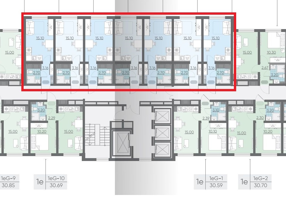 Вот пример планировки этажа в новом ЖК эконом-класса. Это все слепленные студии, где просто невозможно находиться хотя бы в 3 метрах от соседей! Стенка формально есть, но она тонкая. И коридор рядом, а там постоянно будут ходить.