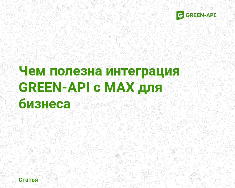Современный бизнес привык работать одновременно с несколькими каналами связи. Клиенты выбирают мессенджеры исходя из их функций и удобства, а компаниям важно обеспечивать в них стабильную и управляемую коммуникацию вне зависимости от выбранной платформы. Ключевую роль в этом играет не конкретный мессенджер, а техническое решение, которое позволяет встроить его в существующие бизнес-процессы. Именно такую задачу решает компания GREEN-API, предоставляя стабильный шлюз API для решения деловых задач предпринимателей. Содержание · Чем занимается компания GREEN-API · Интеграция GREEN-API с мессенджером MAX · Кому подойдет интеграция с MAX · Заключение Чем занимается компания GREEN-API GREEN-API — это компания, специализирующаяся на подключении мессенджеров в корпоративные системы. Мы предоставляем API для бизнеса, с помощью которого компании автоматизируют коммуникацию с клиентами, интегрируют мессенджеры в CRM-системы и корпоративные сервисы, обеспечивая стабильную отправку и получение сооб