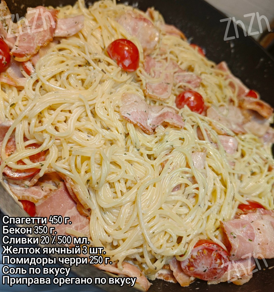Нарезать бекон на ломтики, обжарить в большой сковороде на сливочном масле (можно заменить на подсолнечное) около 10 минут. Отварить спагетти до состояния "аль денте".