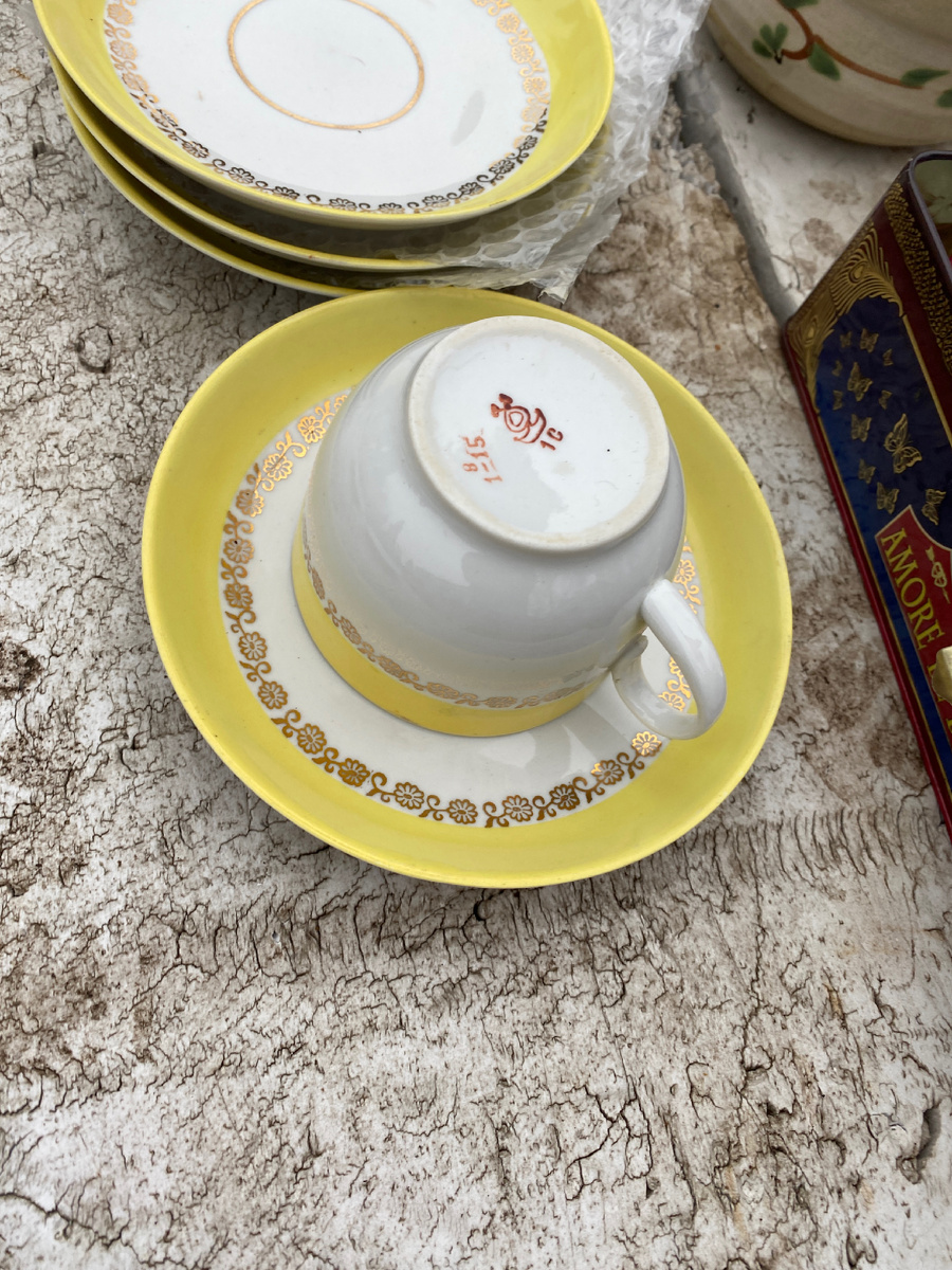 На тульской блошке была найдена симпатичная пара фарфорового завода Пролетарий, украшенная желтой широкой отводкой и цветочным золотистым орнаментом.