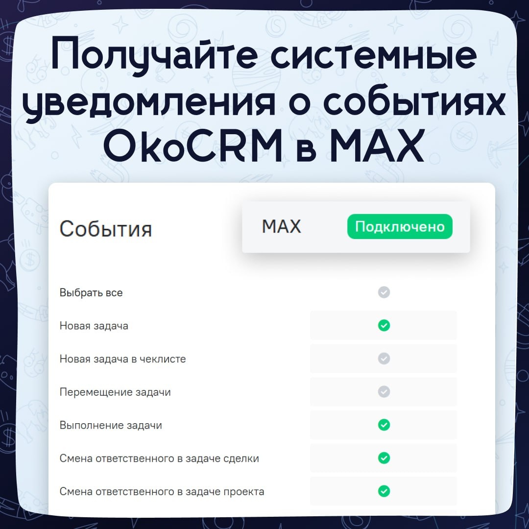 Если вдруг с Телеграм станет сложнее — у вас есть план Б 🙂 Мы добавили системные уведомления от OkoCRM в национальный мессенджер MAX. Теперь сообщения о том, что важно, можно получать и там: ▪️новая сделка ▪️новая задача ▪️комментарий в ленте ▪️входящее сообщение от клиента ▪️письмо и другие уведомления из системы Продолжаем адаптировать OkoCRM к изменениям. Подключите уведомления в Максе на случай, если Telegram вдруг будет нестабилен или неудобен. Мало ли что 😉