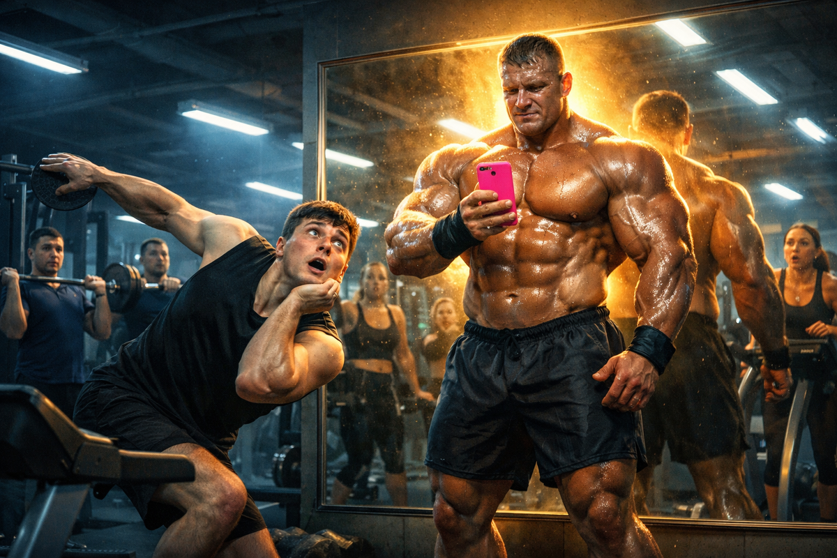 Ты знаешь, как бывает, когда заходишь в качалку? Тишину взрывает только лязг блинов да тяжёлые вздохи. Место, где статуи из мышц разговаривают со своим отражением. И вот в одном таком храме силы, среди обычного вечера, случилась история... В тот день Артём, человек стройный и в душе уже марафонец, переступил порог «Железного храма». Царство стонов железа, пота и зеркал, в которых множатся мускулы. И у этих зеркал, подобно горе, сотканной из плоти и жил, возвышался Геннадий. Борода его была подобна зарослям тёмного леса, взгляд... осколкам гранита. Он беседовал со штангой, тихо и убедительно. Артём, с почти благоговейным ужасом, занял соседнюю беговую дорожку, машину для хрупких. Он пытался раствориться в ритме шагов, но величие Геннадия подавляло. И вот, в этот миг вселенской серьёзности, из глубины бороды прорвался звук. Тоненькая, трогательная детская песенка: «Пусть мама услышит, пусть мама придёт...» Зал замер. Грохот блинов прекратился. Артём на дорожке споткнулся о собственное из