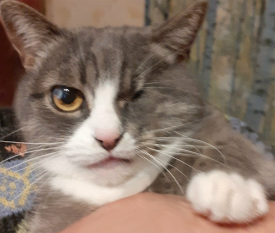 Это особенная кошечка, найденная в 2017 году маленьким котёнком с травмированным глазом, его пришлось удалить. Мусе сейчас 8 лет, с прошлого года начались проблемы с единственным глазом. Лечение помогло и у Муси всё было хорошо. Но сейчас беда вернулась. Появилось бельмо, глаз покрыт серой пленкой, под веком начал образовываться нарост, и есть реальная угроза полной слепоты.
