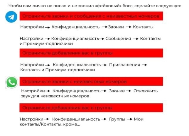 Зафиксирована массовая фишинговая атака с использованием технологии добавления в группу Telegram: «Оцифровка ПАО «КАМАЗ». В группе присутствуют фейковые аккаунты руководителей. На данный момент используется фейковые аккаунты Гумерова И.Ф., Бычининой Н.И., Шарафеевой Ф. Ф., Абраменко А.А., Хурматуллиной Л.Ф. В группе просят перейти в бот «Цифровизация трудового стажа», где присылают якобы код доступа к Госуслугам. Далее поступают сообщения в Telegram и по смс о попытках взлома Госуслуг и необходимости обратиться в техподдержку Госуслуг по указанному в сообщении номеру. Просим принять меры по исключению добавления Вас в фейковые группы, применив приложенные настройки конфиденциальности в Telegram и WhatsApp. Нажать «Пожаловаться на спам». В случае зафиксированных фактов просим информировать руководителя СИБ.