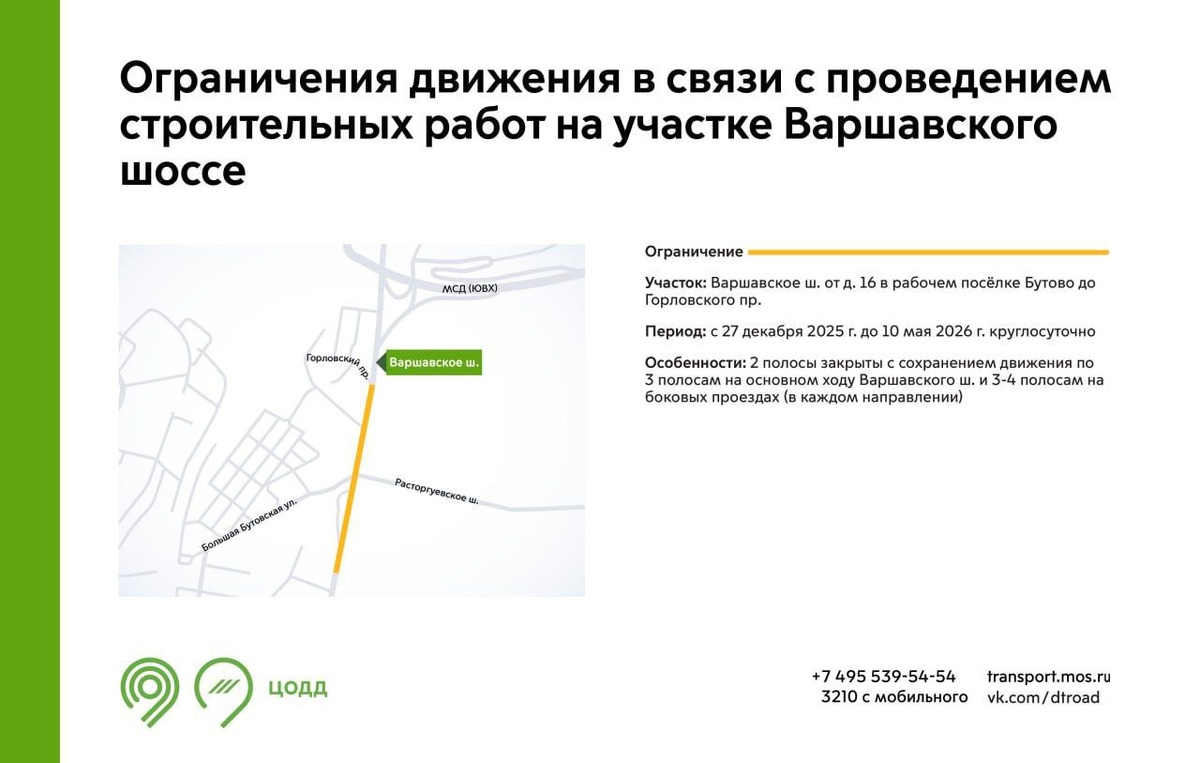 С 27 декабря 2025 г. до 10 мая 2026 г. на участке Варшавского шоссе будут недоступны для движения 2 полосы. Это связано с проведением строительных работ.