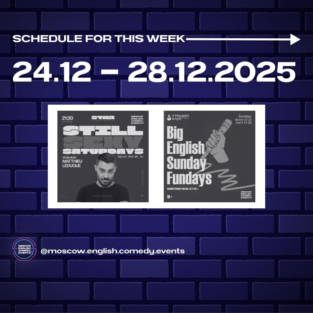 )❗️ -----‐----------------------- 🕤Saturday, December 27th, 9:30 PM – Still Sexy Saturdays 🎤Open Mic 🎟Entrance: Pay what you want (any paper note or transfer) 💵 🔗 Register for free 🫰 pay upon arrival 📍Still StandUp Moscow 🗺 Pokrovka 17c5, through the arch with the pink lights 🏙 Blue building directly inside the courtyard -----‐----------------------- 🕠Sunday December 28th, 5:30 PM - Big English Sunday Fundays 📺Special appearances by famous Russian comics 🎟️Entrance: FREE 💸 Donations welcome, one drink minimum 🔗Reserve for free 📍Stand Up Club на Трубной 🗺 Map: Rozhdestvensky Blvd, 10/7 С1