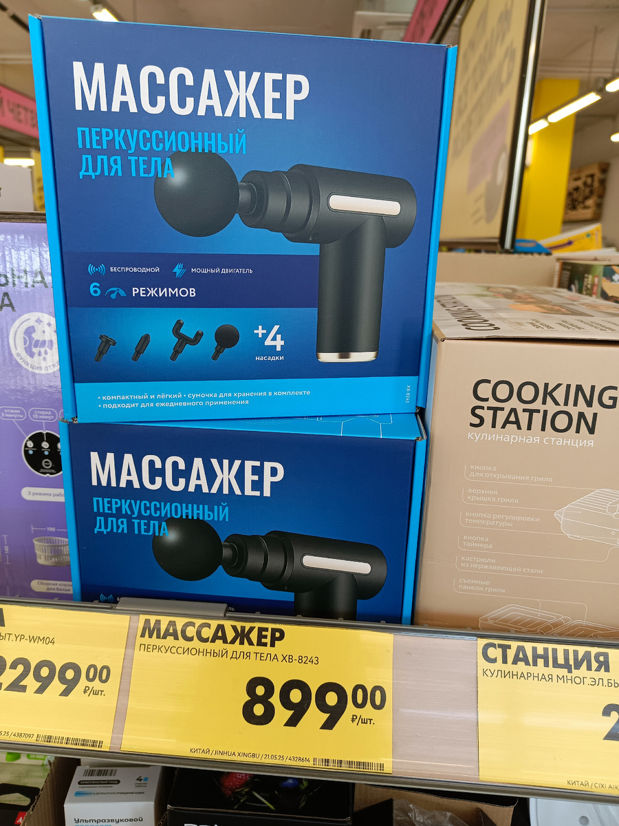 - Массажер перкуссионный беспроводной за 899 рублей: Вот это вещь! После трудовых будней – самое то, чтобы размять косточки. Да еще и с 6 режимами и 4 насадками! Посмотрим, насколько хватит батареи. 🔋