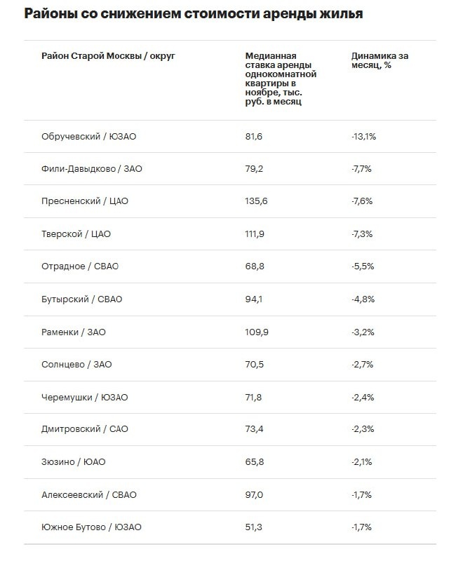 По итогам ноября 2025 года средняя стоимость долгосрочной аренды однокомнатных квартир по данным «Яндекс Аренда» снизилась в 28% районов Старой Москвы. Из районов ЗАО можно выделить: 🔹Фили‑Давыдково — на 7,7% (до 79,2 тыс. руб./мес.), 🔹Раменки — на 3,2% (до 109,9 тыс. руб./мес.), 🔹Солнцево — на 2,7% (до 70,5 тыс. руб./мес.). В то же время в Кунцево аренда подорожала на 13% — до 82,2 тыс. руб./мес.