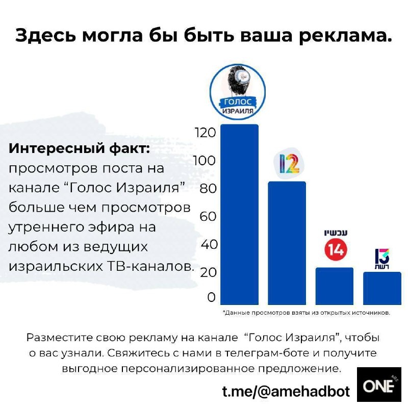 ? Ваша реклама на канале «Голос Израиля» может охватить больше зрителей, чем на любом из телевизионных каналов Израиля в утренние часы. Присоединяйтесь к нашему сообществу рекламодателей прямо сейчас, поддержите канал, получите известность и отличные результаты! Узнать подробности и заказать рекламные пакеты можно здесь @amehadbot
