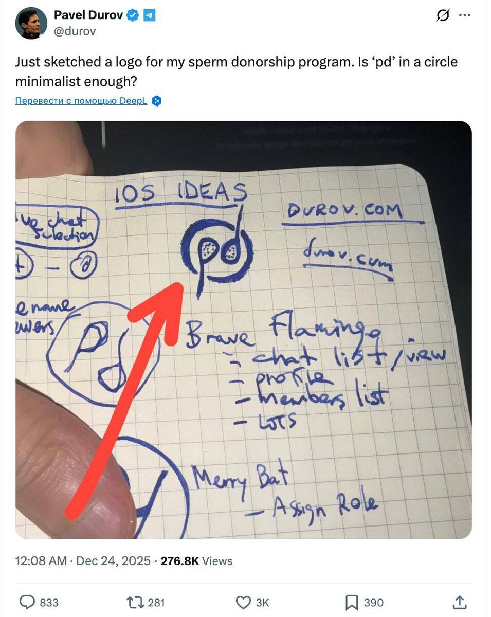 *? У Павла Дурова есть версия. Создатель Telegram и донор спермы Дуров снова удивил публику. Он выложил эскиз логотипа своей программы донорства биоматериала: круг (яйцеклетка), а внутри — его инициалы «p» и «d» в виде сперматозоидов. Французы тут же просветили Дурова: «PD» на сленге значит… гей*. На что Павел ответил: «Значит, это будет негейский* проект, который будет выдавать себя за гейский*. Как президент Франции — только наоборот». * – движение ЛГБТ признано в России экстремистским и запрещено. Сайт "Другая Украина" / Telegram / Вконтакте / Центр поддержки Украинцев / Жалоба на ТЦК 🇷🇺"Другая Украина" теперь в МАХ