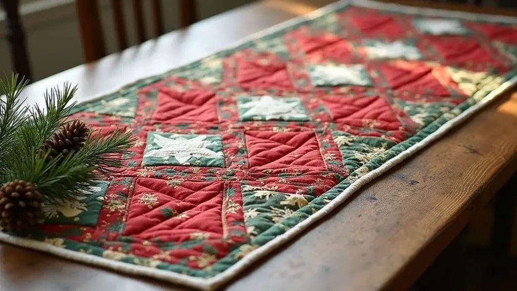 Текстильный декор в новогодней и рождественской тематике является прекрасным дополнением общей концепции декора дома. Это и скатерти, и декоративные наволочки на подушки, и салфетки, и пледы, и панно. Рукодельницы начинают заранее готовиться к празднику, и где-то уже в ноябре берутся за свои творческие проекты, чтобы успеть к кануну празднования. Немаловажную роль у многих играет декор праздничного стола. Стол стараются украсить скатертями, салфетками, дорожками на стол. Кроме обеденного стола, за которым непосредственно и будут происходить праздничные торжества, текстильный декор может украшать полки, тумбочки, небольшие столики или столы в гостиной. Для оформления скатертей и дорожек можно использовать разные техники: пэчворк, квилтинг, лоскутное шитье. Особое внимание нужно уделить цветам ткани и фигурам, которые будут присутствовать на вашем изделии. Идея для эффектной композиции с зеленым лоскутным одеялом. Вырежьте из картона кусок нужного размера в виде треугольника. Пл