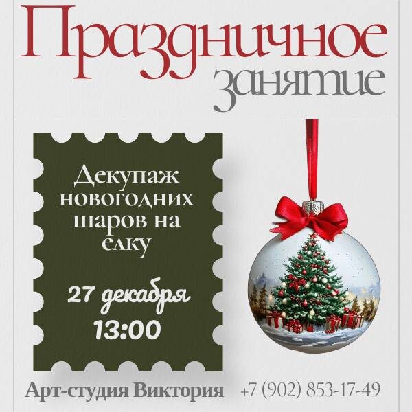 ! Нас ждёт уютное творчество: 🎈 Декупаж волшебных новогодних шаров — создадим главное украшение для ёлки! ✉️ Делаем тёплую праздничную открытку — чтобы передать самые добрые пожелания ручной работы. 🎁 А ещё вас ждут новогодние подарки! Это идеальный способ создать настроение, отдохнуть в хорошей компании и унести с собой частичку праздника, сделанную своими руками. Количество мест ограничено! Записывайтесь! Укажите, если идёте с другом. ❤️ Ждём вас в субботу в 13:00! Давайте вместе завершим год красиво! ☎️ Запись по телефону: 8-902-853-17-49 8-918-064-65-00 📱 Запись онлайн: https://yandex.ru/business/widget/request/company/52017563801 📱 Мы находимся по адресу - г.Новороссийск, улица Южная 10А