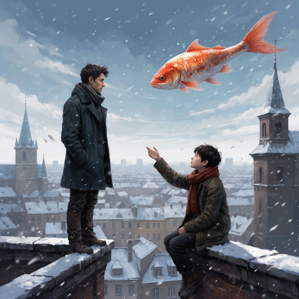 Воздух затрещал, как тонкий лёд, и пополз серебристыми трещинами. В разломе что‑то заблестело. Вальтер осторожно подошёл и заглянул внутрь. Там, в глубине, плыл, переливаясь, огромный карп. Его чешуя напоминала тысячи полированных монет, а глаза были как два чёрных янтаря. Карп открыл рот — и оттуда выплыл пузырь. Внутри него застыла крошечная, но совершенно отчётливая сцена: семилетний Вальтер задувает свечи на торте в форме паровозика.