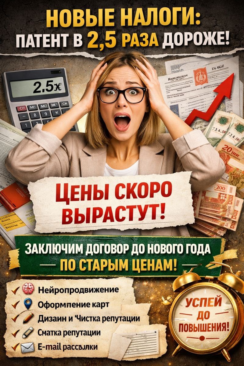 Новости не из приятных 💸 Вчера меня «очень порадовала» мой любимый бухгалтер 😅 Оказалось, что патент подорожал в 2,5 раза. А с учётом того, что с марта я планирую возвращаться на своё ИП — сумма станет ещё больше. Прямо скажем… капец как ощутимо. Как бы мне ни хотелось держать цены прежними, великая и ужасная налоговая настойчиво намекает, что так дальше жить нельзя 🧾⚡ Повышать стоимость услуг в 2,5 раза я, конечно, не собираюсь, но небольшое увеличение будет неизбежно. 👉 Поэтому честно предупреждаю и предлагаю простой вариант: заключить договор ДО Нового года — по текущим условиям и ценам. Что подорожает со временем: • нейропродвижение 🤖 • оформление и актуализация карт Яндекс,2ГИС, гугл карты и другие площадки 📍 • услуги дизайнера 🎨 • чистка репутации 🧹 • увеличение и прокачка репутации ⭐ • оформление рекламных кабинетов 📊 • e-mail-рассылки 📩 • и другие работы Считать по новым ценам я начну в январе 2026, сейчас у меня и так горят сроки по всем фронтам 🔥 Но фиксироват