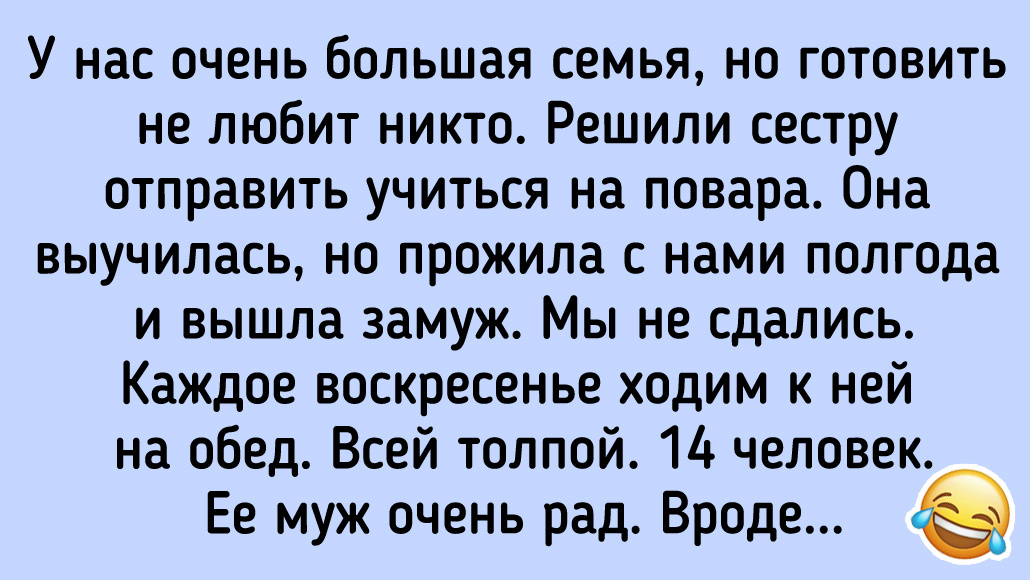 - У меня есть проблема с весом. Пищевое расстройство. И я не люблю об этом говорить, просто ненавижу, когда меня об этом еще и допрашивают. А мои родственники, наоборот, любят обсуждать эту тему. И вот я пришла с сестрой на семейный обед. Все сначала шло гладко, а потом началось: «Что же весишь так мало?», «Когда есть уже начнешь?» Если вы подумали, что тут нет ничего страшного, то это отнюдь не так. Я уже готова была разреветься. Просто встать и убежать. Как вдруг моя сестра говорит: «Мало ест? Да вы посмотрите на эту кобылу...» И быстро перевела тему, родственники даже не поняли. Вот что такое понимание.