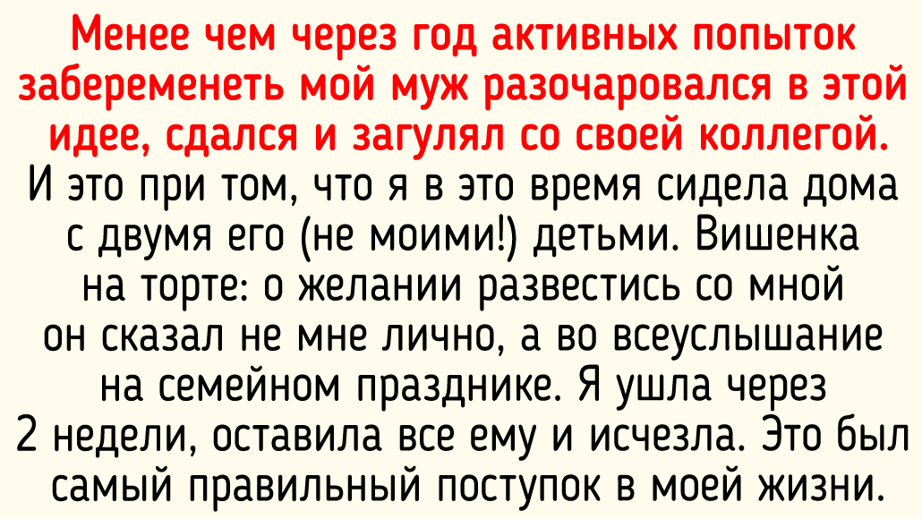 - Бывший муж всю неделю отсутствовал дома под предлогом беспросветной работы. Приехал в пятницу вечером, сложил в пакет трусы, носки, тапки и полотенце, сказал, что едет на выходные в баню к другу. Не спросил даже, есть ли у меня деньги, чем буду кормить малышей и вообще как я буду одна с тремя детьми проводить выходные. Просто взял и уехал. А потом позвонил по видеосвязи с крыши бани и похвалился, как он классно отдыхает и какие у него впереди крутые выходные. Написала ему сообщение, что мы разводимся. Не жалею. © GospojaKot / Pikabu