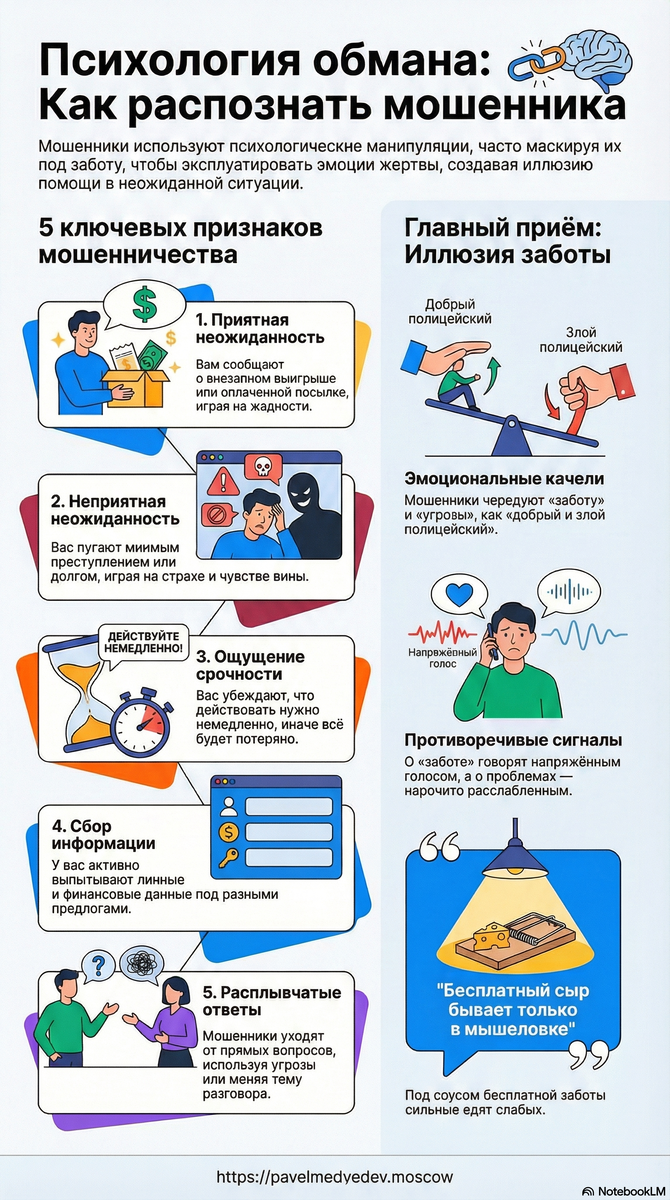Центральный принцип, лежащий в основе всех видов мошенничества, прост: «бесплатный сыр бывает только в мышеловке». Любое неожиданное предложение, кажущееся слишком хорошим, чтобы быть правдой, или внезапная кризисная ситуация, требующая немедленного доверия к незнакомцу, является потенциальной ловушкой. Это руководство создано для того, чтобы детально разобрать распространенные психологические уловки, используемые манипуляторами.