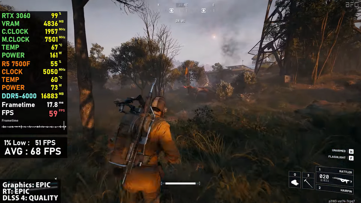 Эксперт YouTube-канала BENCHMARKS FOR GAMERS продемонстрировал, какой производительности можно ожидать сегодня от связки RTX 3060 12 ГБ и Ryzen 5 7500F. Тестовый стенд включал видеокарту Zotac RTX 3060 Twing Edge OC, процессор AMD Ryzen 5 7500F, матплату ASUS TUF Gaming X670E-Plus WIFI, оперативную память Corsair Dominator Platinum 2x16GB, 6000 CL30-36-36-76, корпус Streacom BC1 Open Benchtable, систему охлаждения MO-RA 360, EK-Quantum Velocity Full Nickel, операционную систему Windows 11 25H2, Core Isolation (HVCI) enabled. Среди игр были ARC Raiders, Where Winds Meet, Battlefield 6, Borderlands 4, Doom: The Dark Ages, Mafia: The Old Country, Silent Hill f, Clair Obscur Expedition 33, Assassin's Creed Shadows, Marvel's Spider-Man 2, Warhammer 40.000: Space Marine 2, Kingdom Come: Deliverance II, Cyberpunk 2077, Indiana Jones and the Great Circle, Ghost of Tsushima, Stalker II, The Last of Us Part II, Microsoft Flight Simulator 2024. Battlefield 6 шла с ультра-пресетом, DLSS 4 Quality.