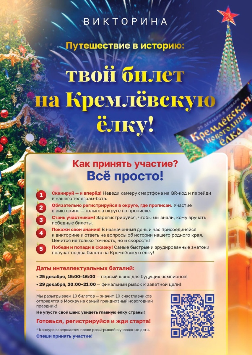 » 🔔Вы еще можете принять участие в увлекательной викторине, которая позволит не только проверить свои знания истории родного края, но и получить шанс выиграть билеты на одно из самых масштабных и ярких новогодних событий страны – Кремлёвскую ёлку. ▫️Для участия необходимо: 1. Навести камеру смартфона на QR-код и перейти в телеграм-бот. 2. Зарегистрироваться, указав проживание в Раменском м.о. 3. В назначенное время пройти викторину, ответить на вопросы не только быстро, но и правильно. ⤵️На конкурс можно перейти по QR-коду или через телеграм-бот @KomandaRamenskyBot на виртуальные приёмные, раздел «Викторина». Даты проведения викторины: 25 декабря с 15:00 до 16:00 — первый тур; 29 декабря с 20:00 до 21:00 — финал. В Раменском муниципальном округе будут определены пять победителей, которые получат по два билета! Организатор викторины — команда региональной приёмной депутата Госдумы Александра Когана. #АлександрКоган #ДепутатГД