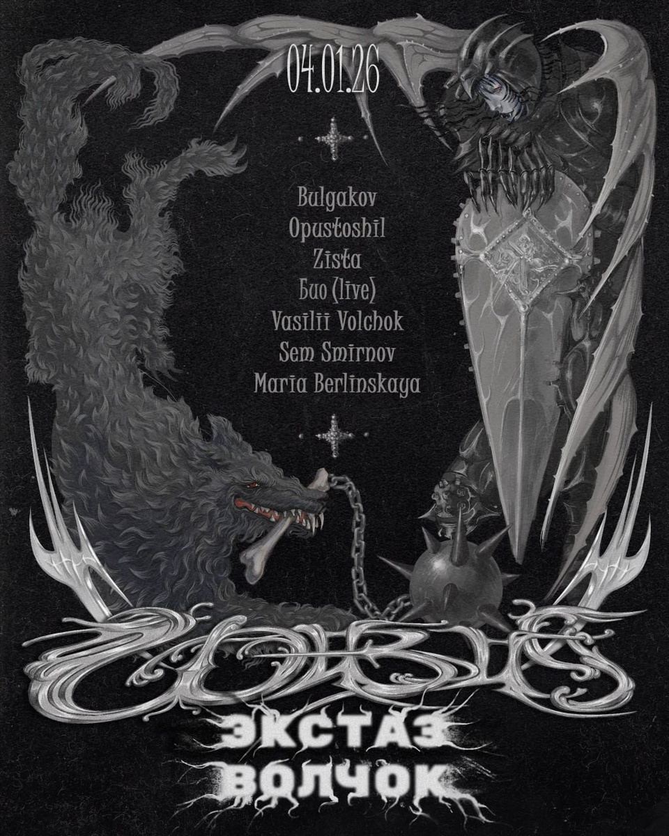 Коллектив состоит из Александра Яковлева - солиста и идеолога группы «Биоконструктор» - и синти-поп дивы Ольги Восканьян. В эту ночь они исполнят лайвом свои хиты. И, конечно, не обойдется без диджей сетов от резидентов ЭКСТАЗА – Bulgakov, Zista и Opustoshil и резидентов ВОЛЧКА – Sem Smirnov, Maria Berlinskaya и Vasilii Volchok. Ночь обещает быть наполненной пост-индустриальной и синтезаторной музыкой. Билеты для ранних пташек доступны по ссылке 😈 Хотим провести это 4 января в кругу единомышленников. Ждем вас.