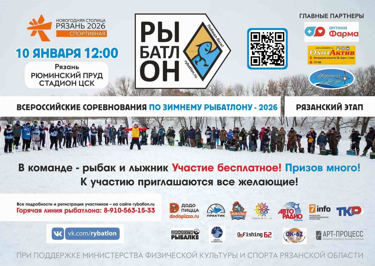 В субботу 10 января с 12:00 в Рязани пройдут всероссийские командные соревнования по зимнему рыбатлону. Рязанский этап в этом году пройдет на знакомом месте, в центре города на Рюминском пруду, прямо под стадионом ЦСК. Регистрация команд из рыбака и лыжника уже идет на главной странице сайта rybatlon.ru К участию в зимнем чемпионате приглашаются все желающие, независимо от возраста, пола и рыболовно-лыжных способностей. Команды можно формировать абсолютно любые! Участие в рыбатлоне бесплатное, а призов по традиции – очень много: от различных сертификатов на солидные суммы и пауэрбанков до подводной видеокамеры и крутых дождевиков (все призы озвучиваются в официальной группе рыбатлона в ВК. Правила прежние и очень простые – за полтора часа рыбаку нужно поймать две любые рыбы, а лыжнику пробежать два круга по полтора километра. Между участниками команды несколько раз передается эстафета. Стартуют рыбаки, финишируют лыжники. Полные правила читайте на сайте рыбатлона. Как всегда, три лучши