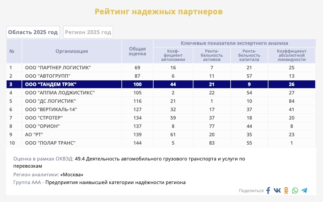 Компания «Тандем Трэк» вновь подтвердила свой статус надёжного и ответственного перевозчика! По результатам экспертной оценки финансово-экономических показателей предприятий транспортной отрасли (ОКВЭД 49.3) наша компания вошла в Рейтинг надёжных партнёров Центрального федерального округа. Тандем Трэк в рейтинге надежных партнеров: https://www.analit-centr.ru/7713743650 Рейтинг формировался на основе анализа 1402 компаний отрасли и региона. Экспертная комиссия изучала целый ряд финансовых и деловых показателей — от устойчивости и ликвидности до рентабельности и эффективности использования ресурсов. «Тандем Трэк» успешно прошла все этапы оценки и получила статус рекомендованной компании для сотрудничества и инвестирования. Вхождение в Рейтинг надёжных партнёров — это подтверждение стабильности, прозрачности и высокого уровня доверия к компании. Как формируется Рейтинг надёжных партнёров Рейтинг проводится на основании данных РОССТАТа за предыдущий отчётный период и включает следующие эт