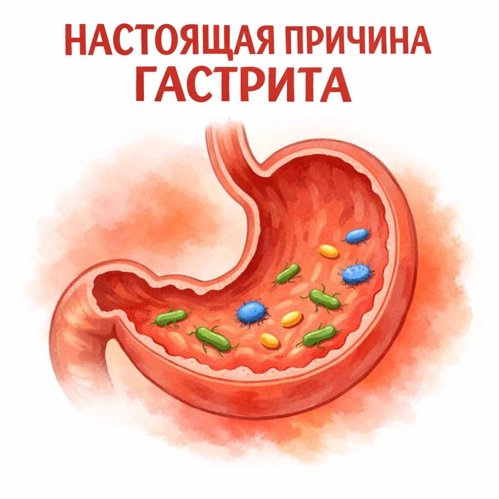 Гастрит — это не про еду Еда усиливает симптомы Но редко является причиной ⏺️Главная причина хронического гастрита Бактерия Helicobacter pylori Она выявляется в 80–90% случаев Вызывает длительное воспаление слизистой желудка ⏺️Когда гастрит бывает острым — алкоголь — острая, жирная, жареная пища — слишком горячая или холодная еда — пищевые отравления — аллергия ⏺️Другие причины — длительный приём НПВС — хронический стресс — аутоиммунные процессы — заброс желчи в желудок Главная ошибка — лечить гастрит диетой Не устраняя реальную причину