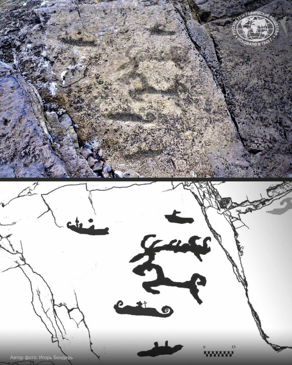 Их открыл член РГО Игорь Бондарь во время комплексной научной экспедиции Арктического плавучего университета и РГО. В академическом журнале «Скандинавская филология» (издается Санкт-Петербургским госуниверситетом на английском языке, рецензируется в базах Web of Science и РИНЦ) появилась большая научная публикация о петроглифах, обнаруженных на острове Вайгач. Речь идет о двух каменных полотнах на юге острова. На одной из скальных поверхностей изображены несколько рисунков, предположительно, символически описывающих сцену охоты на оленя. На другом фрагменте читаются абстрактные знаки. Обнаруженные петроглифы являются самыми северными на территории России. До сих пор таковыми считались наскальные изображения в низовьях реки Пегтымель на Чукотке, выявленные в середине 60-х годов ХХ века. Руководитель лаборатории RSSDA (дистанционного зондирования и анализа пространственных данных), заведующий лабораторией цифровой археологии в Институте классического Востока и Античности НИУ ВШЭ, участн
