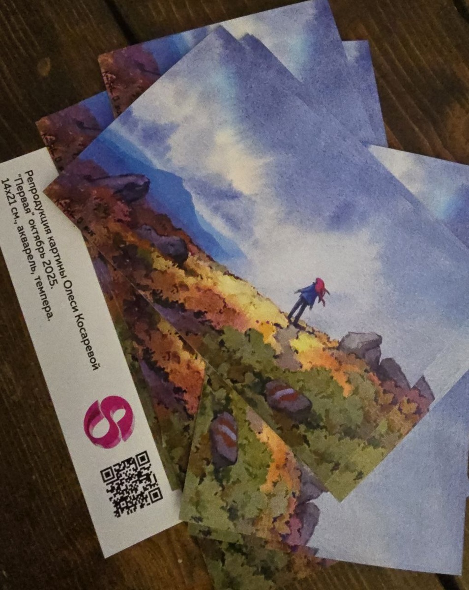 Открытка - репродукция картины @aqualeska (Олеся Косарева | Акварель) "Первая" октябрь 2025. 14х21 см., акварель, темпера. Картину Олеся подарила мне в Екатеринбурге на встрече и дала добро напечатать открытки. Я смотрю на её работу и чувствую себя Маленьким принцем (или принцессой))))