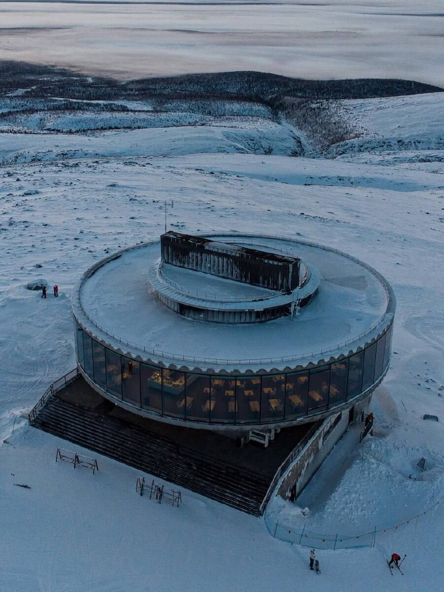 Его построили в 2021 году в Кировске, на горнолыжном курорте «Большой Вудъявр». Он расположен на склоне горы Айкуайвенчорр, на высоте 820 метров над уровнем моря, и отлично вписан в суровый, лаконичный пейзаж Хибин. Благодаря панорамному остеклению высотой 5 метров, обзору на 360° и особой «парящей» конструкции здания, открываются шикарные северные пейзажи — если повезёт, даже с местными спецэффектами в виде северного сияния 😍 📷 : polar_stat1on