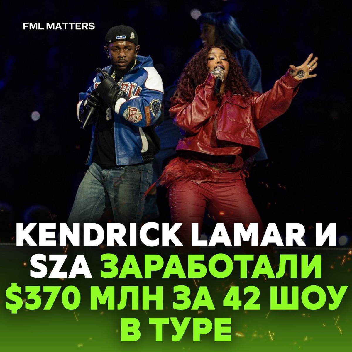 ! Совместный тур «Grand National Tour» Кендрика Ламара и SZA стал финансовым триумфом — $369,6 млн сборов и 1,9 млн проданных билетов. По версии Billboard, это самый успешный рэп-тур 2025 года. ❤️🔥 / 👎 💀 FML MATTERS