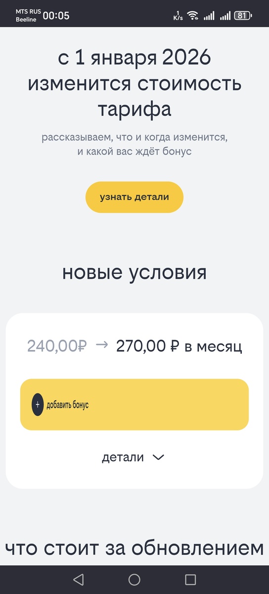 Новый год не только праздник, но и время существенных перемен. С этого праздника мобильные операторы массово поднимают стоимость тарифов. Билайн честно предупредил меня об изменениях в оплате тарифа и даже попытался объясниться. У меня архивный тариф, плачу за него немного по современным меркам. Но я практически не пользуюсь связью, то есть фактически плачу за сим-карту и возможность со мной связаться. Чем мошенники активно и пытаются воспользоваться. Хотя количество звонков существенно сократилось, особенно, когда билайн пообещал платить за входящие. Интернет у меня в основном через вай фай, разговоры тоже. Итак, мои цифры: 30 рублей - это много или мало? 30*12=360 рублей за год. У кого тариф стоил дороже соответственно и поднимется больше скорее всего, а это существенно ударит по бюджету и еже еся, ным трата, особенно, для тех у кого ипотека и другие кредитные обязательства. Это называется - "Новые условия" . Что стоит за обновлением тарифа: Я думаю, что со временем всё это