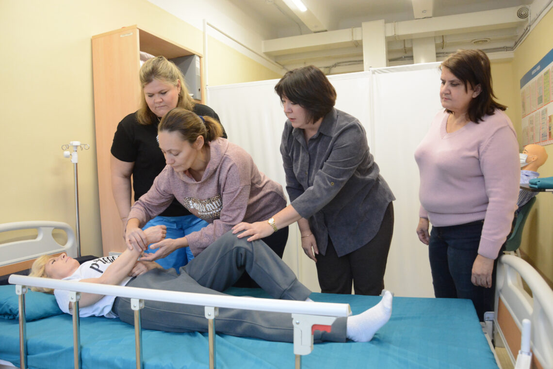 При этом основной упор делаем на практику. На уроках демонстрируем, как правильно пользоваться техническими средствами реабилитации, объясняем, как можно пересадить, перевернуть человека, не сорвав при этом свою спину, а также как правильно его кормить и мыть, что делать для профилактики пролежней. Все действия показываем на ком-то из присутствующих, за исключением, конечно, гигиенических процедур: в этом плане выручает манекен.