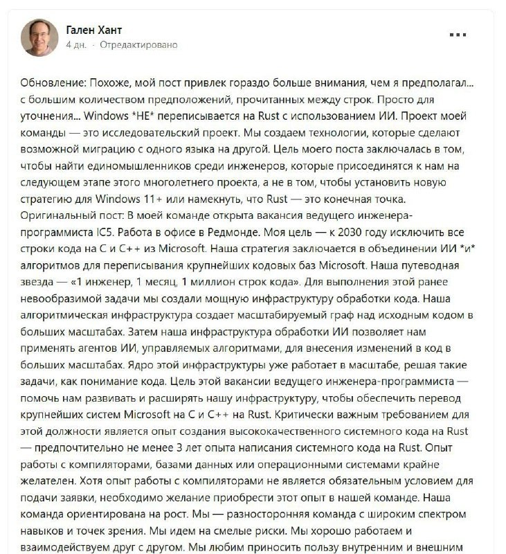 Цель инициативы отказаться от использования устаревших языков C и C++ в ключевых продуктах компании. Завершить переход Microsoft рассчитывает к 2030 году. Чтобы всё прошло быстрее, будут использовать нейросети, которые займутся переработкой миллионов строк существующего кода. Гален Хант, один из главных инженеров Microsoft, заявил: Моя цель уничтожить каждую строчку C и C++ в компании. Не надо, дядя. CtrlAltDelights- подписаться
