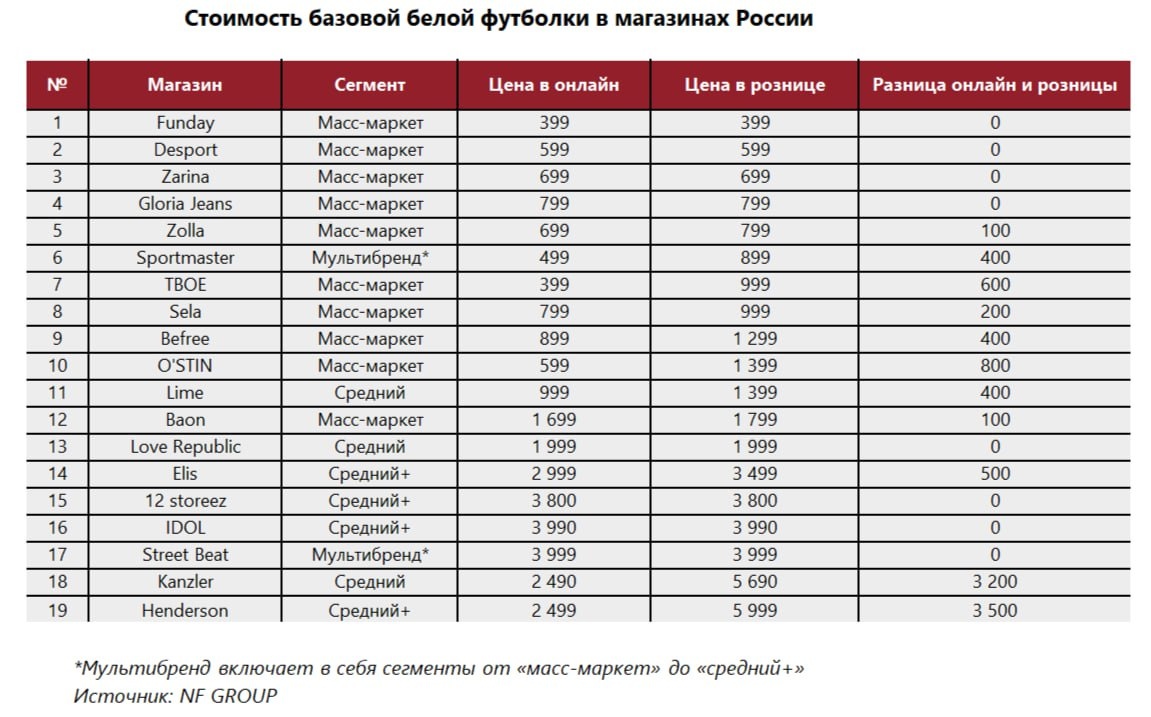 Исследование выявило взаимосвязь между масштабом розничной сети и ценовым позиционированием брендов: чем шире представлена сеть, тем более доступный ценовой уровень она демонстрирует, и наоборот. Так, в группе сетей с более 250 точками средневзвешенная цена базовой футболки составляет 968 руб. У брендов со 100–250 магазинами этот показатель равен 2259 руб., а у игроков с менее 100 точками – 3231 руб. В интернет-магазинах — 1 624 ₽, в рознице — 1 528 ₽. Разница минимальная, но внутри рынка картина куда контрастнее. Маркетплейсы выбиваются из общей логики: 🔵 Средняя цена футболки на Ozon, Wildberries, Lamoda и «Яндекс.Маркете» — 626 ₽, более чем вдвое ниже рынка. Конкурировать с ними по цене смогли только Funday и Desport. Ближе всего к «средней температуре» рынка — O’STIN и Lime с ценой 1 399 ₽. Эти бренды занимают около 17% всех торговых точек и фактически задают базовый ценовой ориентир.