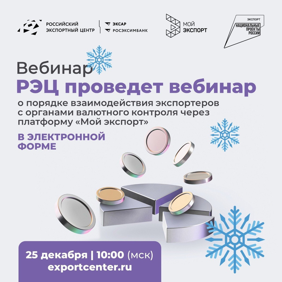 Ещё можно присоединиться к вебинару Российского экспортного центра, который будет посвящён актуальным обновлениям в валютном контроле для
