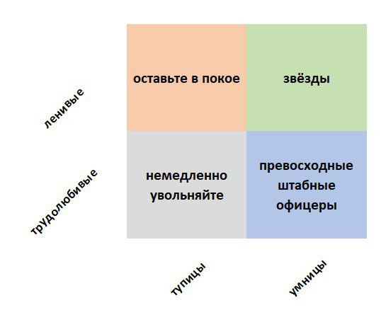 Согласно местами шуточной, но очень правдивой матрице генерала фон Манштейна, существует лишь 4 типа офицеров: ➡️ 1 тип – это ленивые и глупые офицеры. Оставьте их, они не приносят вреда … ➡️ 2 тип – это умные и трудолюбивые офицеры. Из них получаются превосходные штабные офицеры, от внимания которых не ускользнут мельчайшие детали ➡️ 3 тип – трудолюбивые тупицы. Опасны и должны немедленно увольняться. Они загружают всех совершенно ненужной работой ➡️ 4 тип – это умные бездельники. Достойны самых высоких должностей. Эта теория отлично ложится на проектное управление, сохраним авторскую терминологию. В проектах, как на войне есть 4 основных типа участников команды: ✅ 1. Ленивые тупицы Не бойтесь их слишком сильно. Сидят тихо, делают ровно минимум по ТЗ (если очень всё расписать), не лезут с инициативами Польза: Не создают лишнего хаоса. Иногда нужны для рутины Риск: Могут "завалить" критическую задачу из-за непонимания, нехватки компетенций ▫️Держите их на простых заданиях ✅✅ 2.