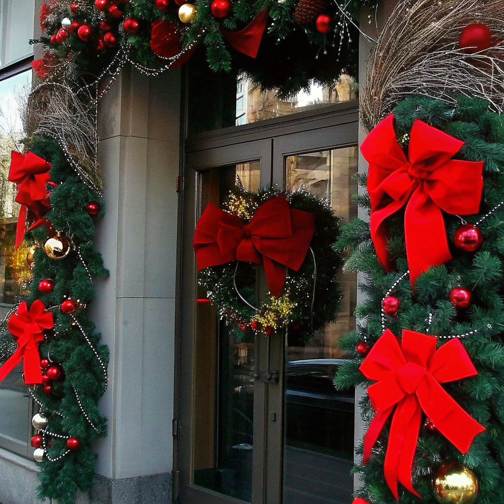 — Гирлянды и декоративное освещение. Их можно расположить по периметру окон, вплести в еловые композиции, обрамить гирляндами центральные объекты. Мягкое мерцающее свечение привлекает внимание даже издалека и формирует настроение.