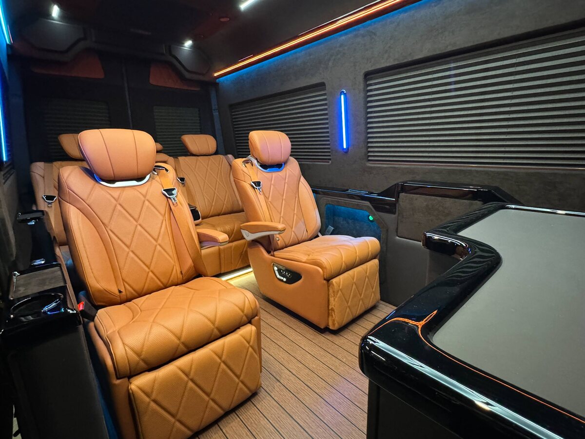 Стоит отметить, что водители Mercedes-Benz Sprinter не ограничены в пространстве и удобстве, имея возможность настраивать положение индивидуально под себя. Кабина водителя выполнена в тон пассажирского салона, отделаны торпедо и дверные карты для того, чтобы каждый сантиметр этого роскошного микроавтобуса приносил чувство гордости и успеха. Мультимедиа: TV 4K – диагональю 43 дюйма со SMART TV, WI-FI роутер, аудиосистема расширенного звучания с усилителем и сабвуфером Focal.
