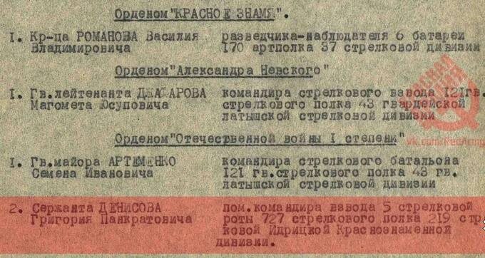 24 декабря 1944 года в решительный момент боя за д. Рудини в Латвии сержант Г.П. Денисов перебежками добрался до немецкого дзота и навалился на ствол пулемета, закрыв его своим телом. Был призван в РККА также в Латвии в 1944 года. За свой подвиг представлялся к званию Героя Советского Союза.