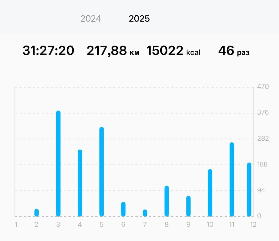 Кому как, конечно, я понимаю Но итоги мои, мне будет со знаком + Итак, итог 2 за 2025 Я начала бегать Не то, чтобы я раньше не пробовала или не бегала… Но в феврале, в отпуске, встав на дорожку я бежала. Через 10 минут я подумала, что точно могу еще. Еще через 5 было неимоверно сложно и очень хотелось остановиться. Еще через 5 минут открылось второе дыхание и вот ты уже просто бежишь, не думая ни о чем, ты можешь бежать еще, и еще Я никогда не делала это постоянно, системно и с кайфом. Признаюсь, от процесса кайф редко, хотя и так бывало, а вот от результата и энергия после тренировки всегда 🔥 Кому-то мой итог будет мизерным, кому-то вау Но я точно сделала что-то новое, я точно не буду как раньше ПС: на графике не хватает 2 или 3 тренировки, когда не было трекера, поэтому 220+ км за год А за прошлый 0 Ну, кто молодец, я молодец 😁