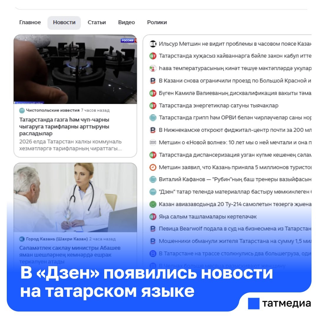 🇷🇺👨💻В «Дзен» появились новости на татарском языке Теперь жители РТ имеют возможность свободно знакомиться с актуальными событиями в своем регионе как на русском, так и на татарском языке, формируя таким образом полноценную региональную новостную ленту. Специальный раздел «Казань» на сайте dzen.ru автоматически отображается на главной странице у пользователей из республики при активации геолокации или ручном указании города. Для выбора языка контента достаточно использовать переключатель в верхней части канала. Публикации размещаются татароязычными авторами и СМИ, что гарантирует точность передачи информации. @tatmediaofficial | Все каналы Татмедиа ™️ 1-й новостной MAX-канал Татарстана - подпишитесь.