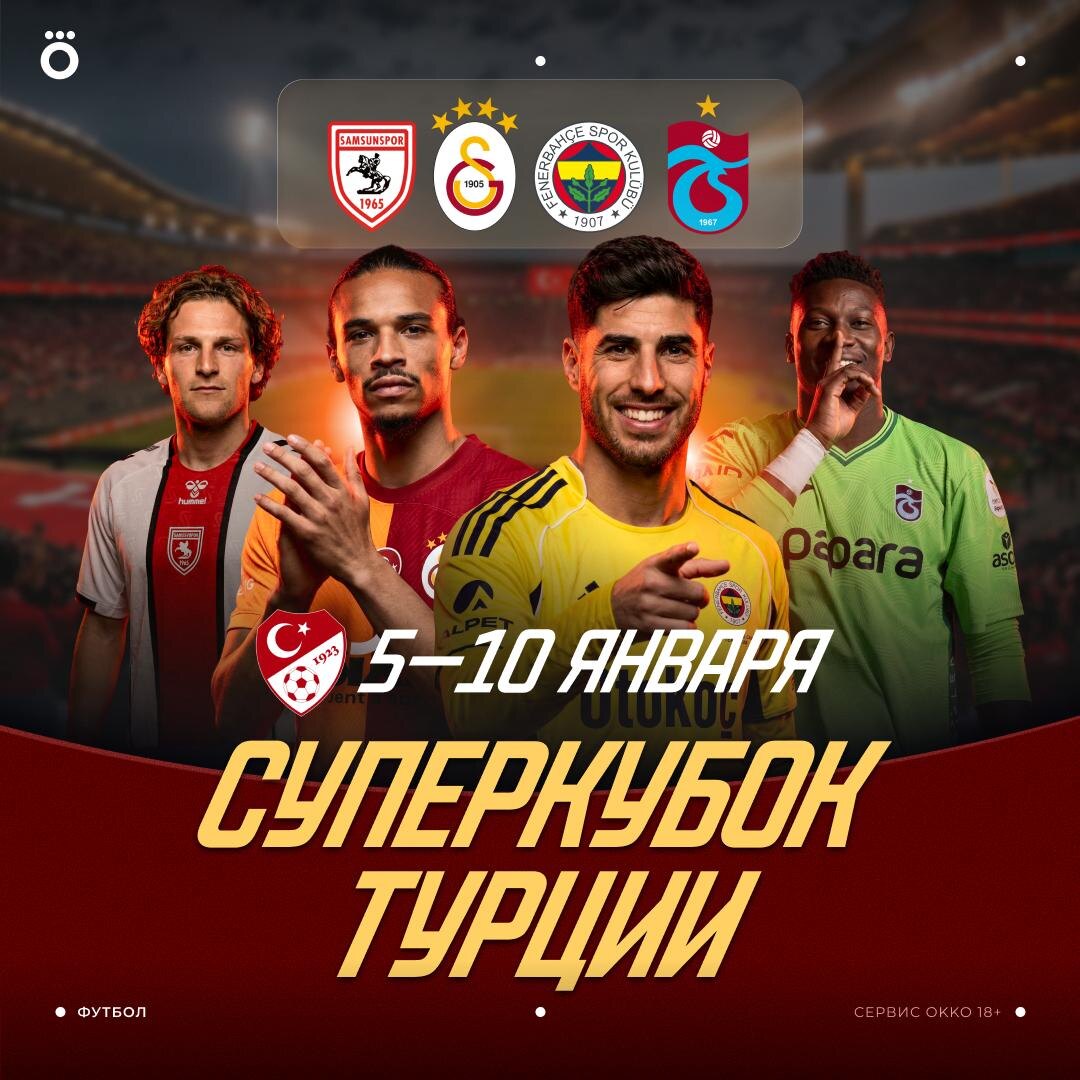 🇹🇷 Турнир пройдет в новом формате с участием четырех команд: победителя чемпионата и Кубка, финалиста Кубка и двух других сильнейших клубов по итогам сезона. В этом году в Суперкубке сыграют «Галатасарай», «Трабзонспор», «Фенербахче» и «Самсунспор». Полуфиналы состоятся 5 и 6 января, финал – 10 января. Смотри в Okko 😆