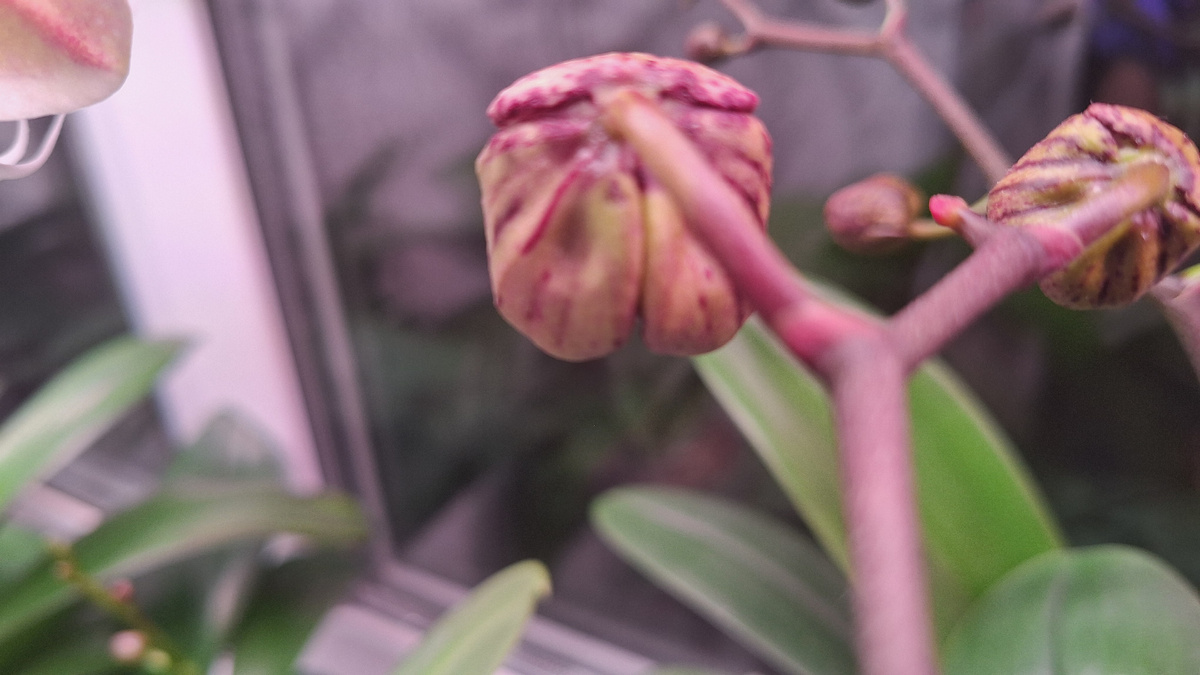 Речь пойдет об орхидее в моей коллекции, которая скоро зацветёт. Это будет второе её цветение дома. Купила я её в Лемана ПРО пару лет назад, даже меньше двух лет. Тогда привезли очень много фаленопсисов. Была весна. И такое было ощущение, что когда я только подошла с стеллажам из множества орхидей, она как будто смотрела на меня, и мои глаза сразу остановились именно на ней. Орхидея эта не совсем обычная. Сейчас покажу её бутоны на сегодня. Догадались, что за гибрид? Цвести этот фаленопсис будет на двух цветоносах и ещё боковом ответвлении. Вообще эта орхидея часто встречается в мутации. Это либо бабочка, либо мутация по цвету. Но я ни разу не встречала пелора в виде тюльпана или трилипса. Да, это Арт Ново(Art Nouveau). На фото ниже половина цветка - её стандартное цветение, а вторая половина, в тёмном окрасе - это мутация цвета. Вот ещё фото Здесь нижние цветочки полностью стандартные. А вот эта орхидея полностью в тёмном окрасе: Какая краше? Светлая или тёмная? 🤔Даже не зна