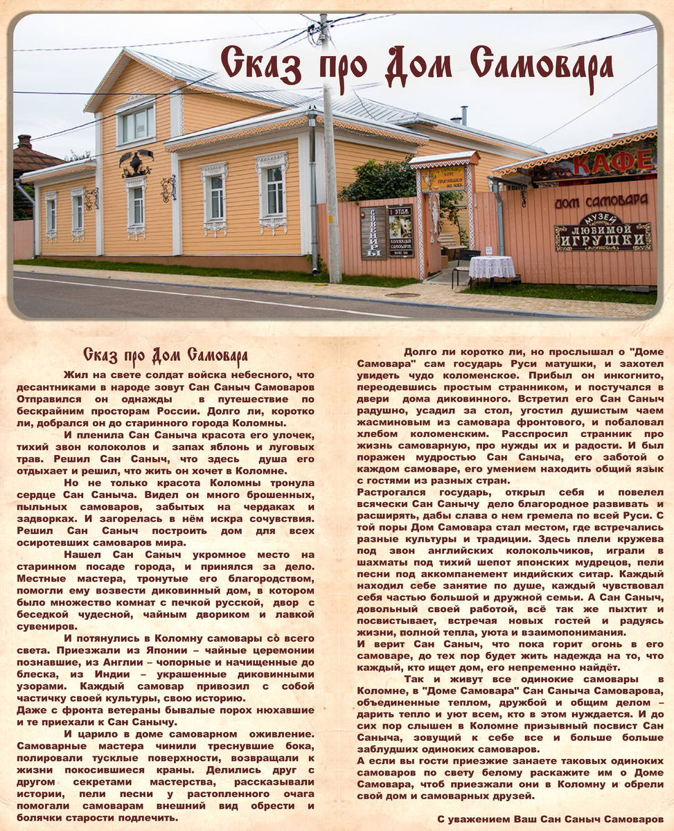 Но не только красота Коломны тронула сердце Сан Саныча. Видел он много брошенных, пыльных самоваров, забытых на чердаках и задворках. И загорелась в нём искра сочувствия. Решил Сан Саныч построить дом для всех осиротевших самоваров мира.