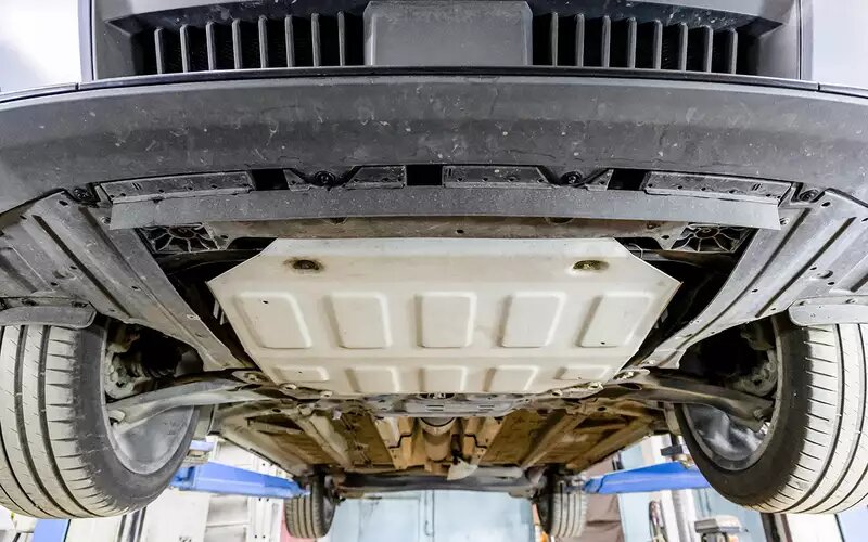 Снизу, вместе со сливной пробкой, расположен и масляный фильтр. Чтобы их увидеть, нужно снять мощную металлическую защиту. Держится она на четырех болтах с головками «на 10». Желательно под рукой иметь гидравлическую стойку или помощника. В одиночку сложно одновременно держать тяжелый лист и откручивать крепеж.